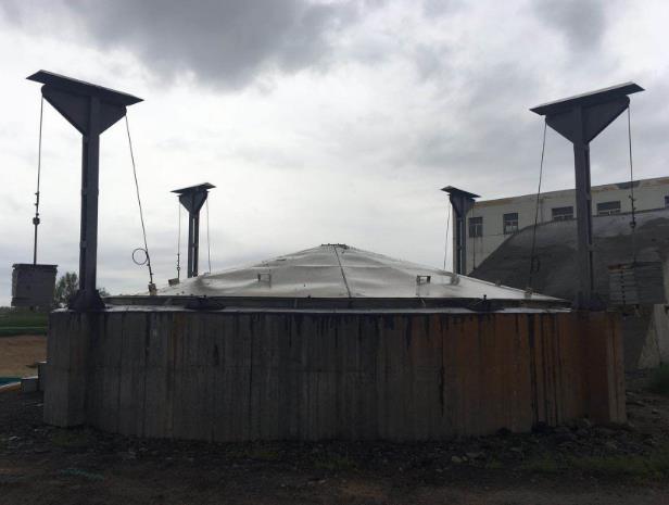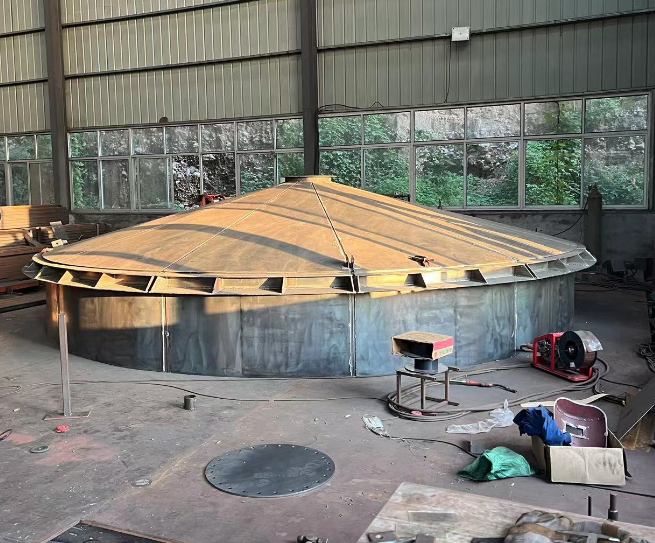 1、門體的圓錐形蓋與圓筒形立壁及外密封圈焊接成一體,圓錐形防爆蓋分為扇形弧面結(jié)構(gòu)的8塊,遠程智能自復(fù)式立井防爆門的各塊之間加膠墊用螺栓緊固,主要材料為75x50x5角鋼、Q235厚度4毫米鋼板;20x80mm硅膠密封條。